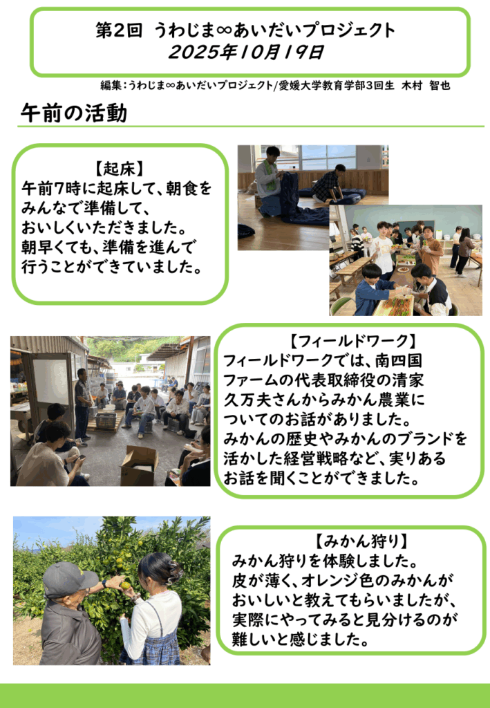 本年度のうわじま∞あいだいプロジェクトの第1回・第2回は2日間続けてのプロジェクトでした。2日間本当にお世話になりました。次回のプロジェクトは、11月8日に愛媛大学学生祭にお招きします。これからもよろしくお願いいたします。(報告者:大石有美香)