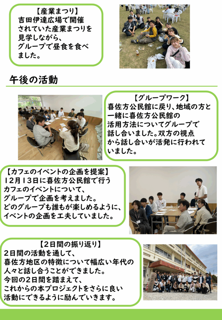 午前の部では、南四国ファームにお邪魔して、みかんの歴史や販売の工夫などについて学びました。その後は実際に、みかん狩りを経験し、美味しいみかんをいただきました。午後の部では、産業祭りにいき、おいしい食べ物を楽しみました。その後は、喜佐方公民館に帰ってきて、12月13日に開催される「まちかどカフェ」のイベント提案をしました。以下は、当日の様子です。