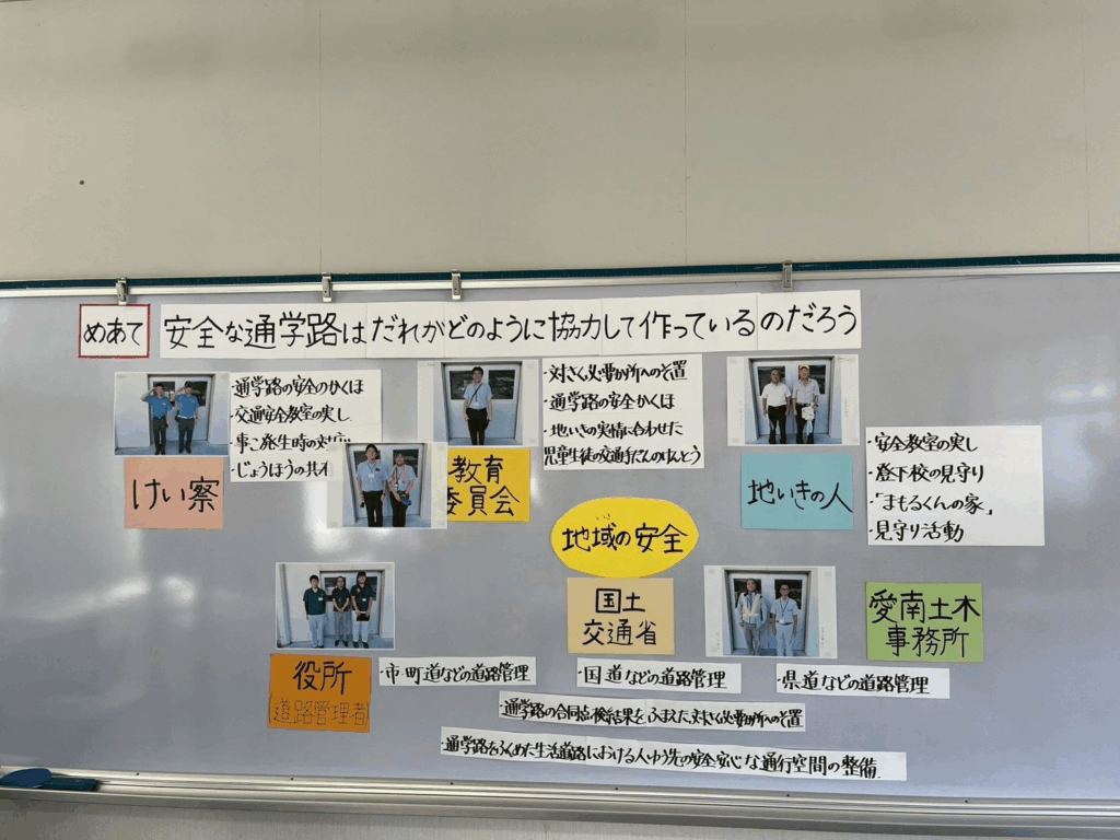 前半は、「安全な通学路は誰が作っているのだろう」という問いを設定し、通学路の安全にかかわる機関を6つ(警察、愛南町役場、国土交通省、愛南土木事務所、教育委員会、地域の人)挙げ、その役割について理解させました。