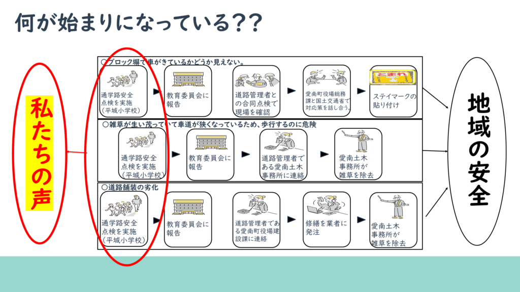 後半は、「安全な通学路はどのように協力して作っているのだろう」という問いを設定し、安全な通学路ができるまでのプロセスを学ばせました。加えて、「私たち(子どもを含めた市民)の声」が始まりとなって、安全な通学路を作るための取り組みが推進されていることに気付かせました。