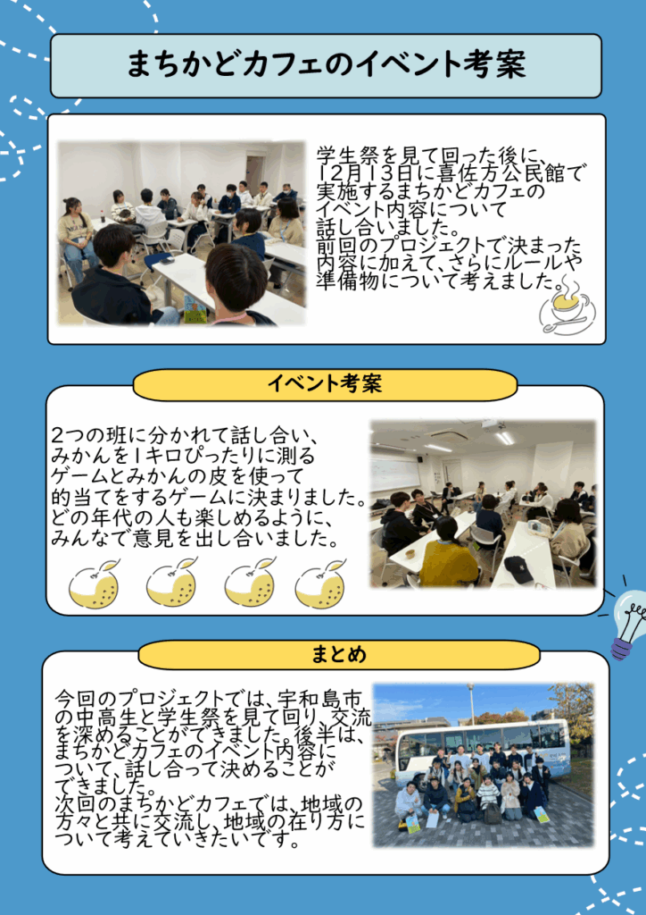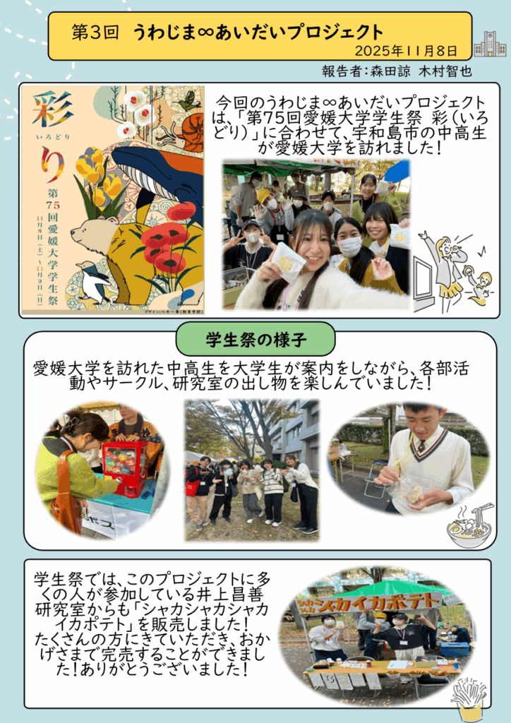 2025年11月8日(土)に、第3回目のプログラムが、愛媛大学にて行われました。今回は、宇和島の中高生に愛媛大学の学生祭を楽しんでもらいました。