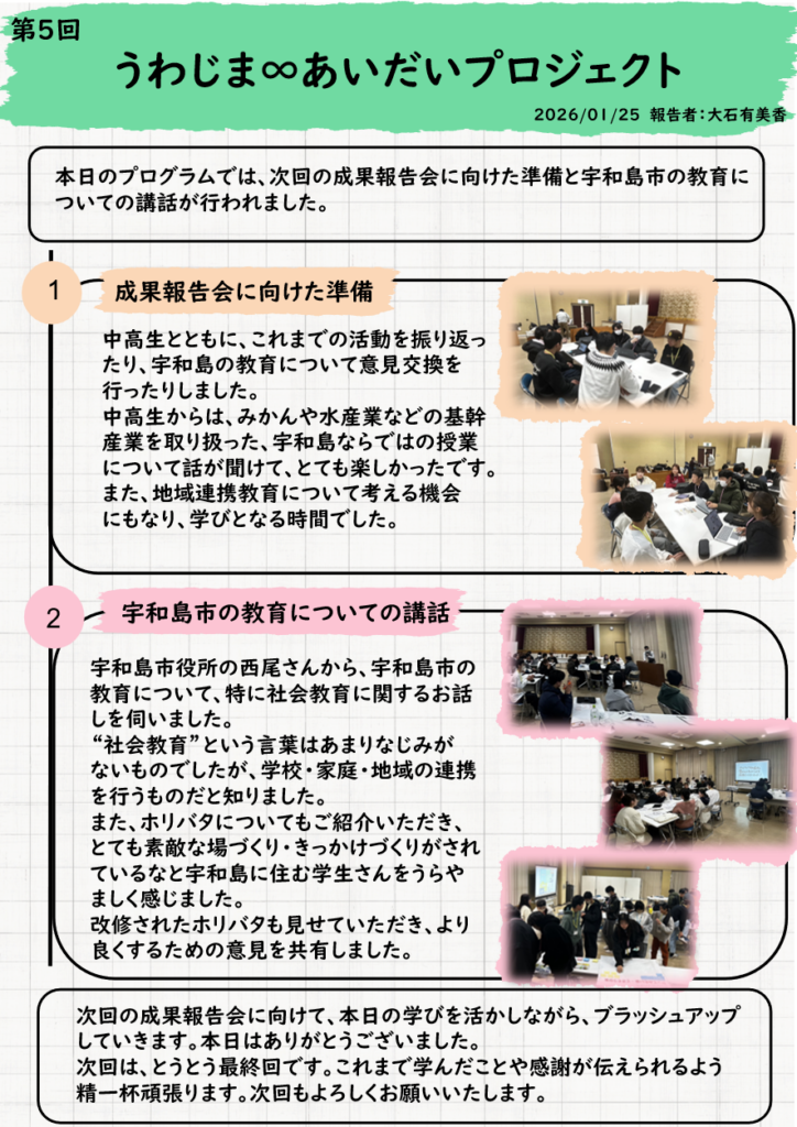 2025年1月25日(日)、第5回目のプログラムが、宇和島市中央公民館にて行われました。今回は、次回の成果報告会に向けた準備を主に行いました。また、宇和島市教育委員会の西尾さんのお話しを伺い、社会教育について学びました。以下は、活動の様子です。