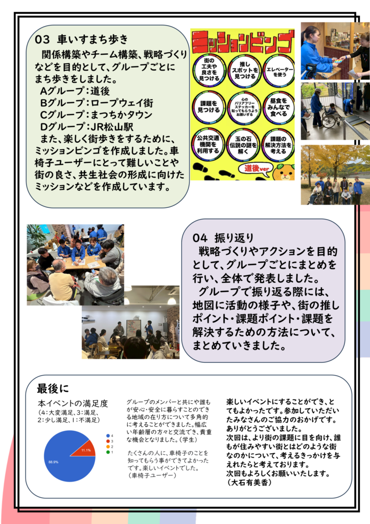 9月23日(火)堀江公民館にて、人権啓発推進大会が行われました。そこでは、石川水緒さんと行った取り組みの紹介をしました。特に、私たちは昨年度行われた車いすまち歩きイベントについてお話ししました。車椅子ユーザーや子どもを含めた地域住民とビンゴを達成するという目標で行ったことで、今までの「“~してあげる”・“~してもらう”」という構図ではなく、健常者と障害者やマイノリティの人々が相互作用を起こすことの大切さについてお話しさせていただきました。
